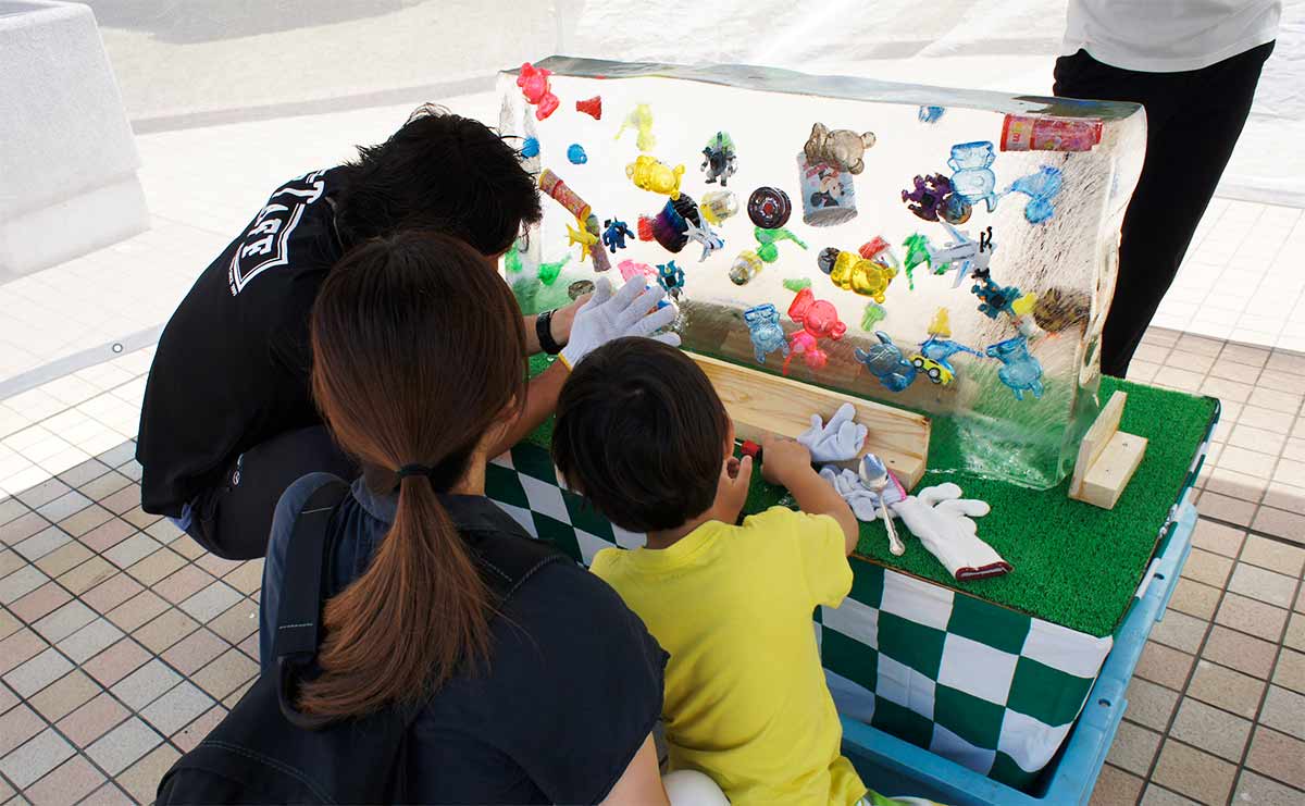 宝探し気分で氷の中からおもちゃを発掘!透き通った氷柱は見た目にも涼しく、暑い夏にぴったりの大人気イベントです。