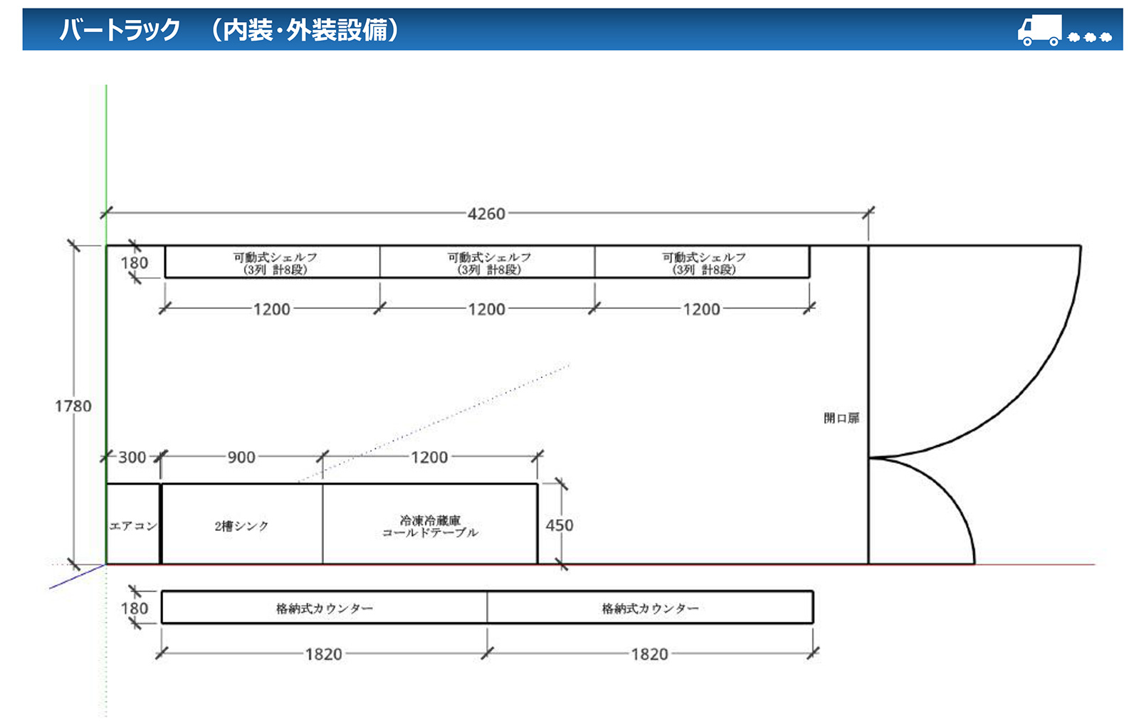 | 商品説明 | イベント用、移動販売用、撮影用レンタル等。壁⾯には可動式のシェルフを備え、⽤途に合わせて⾃由に組み換えが可能です。 |