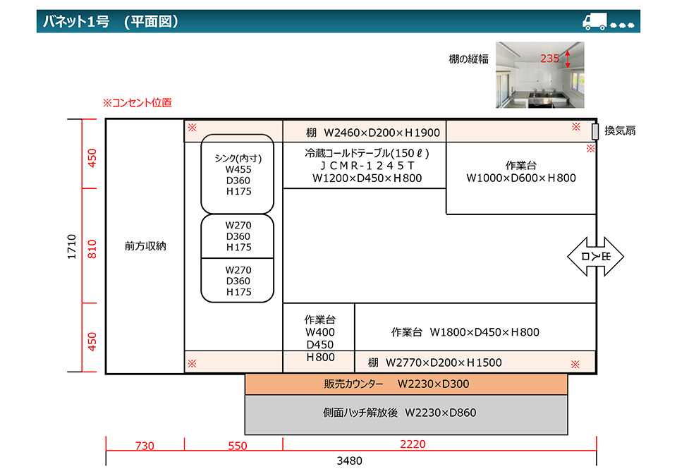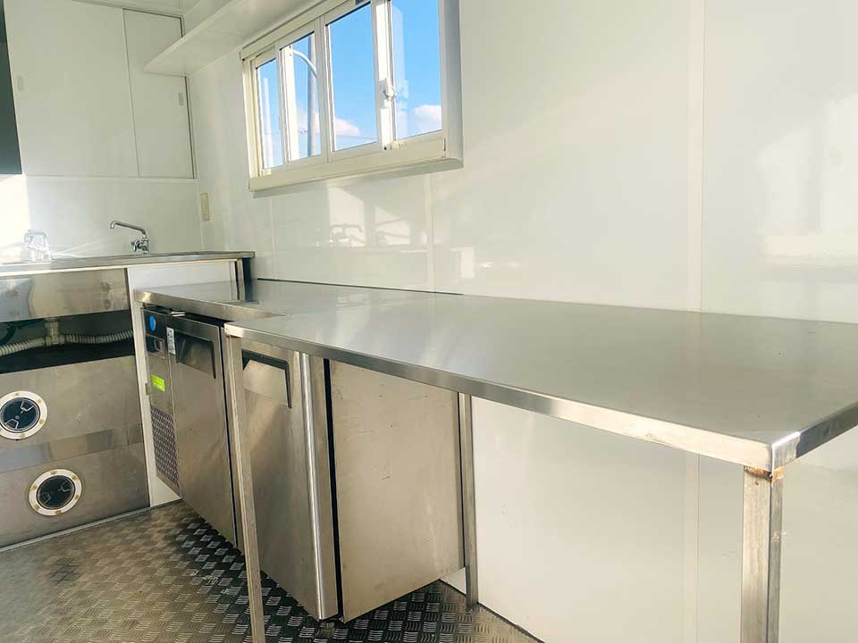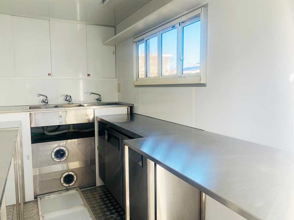 | 商品説明 | イベント用、移動販売用、撮影用レンタル等。シンプルな見た目の中型キッチンカーです。収納、作業スペースも十分にありプロモーションイベントでも活躍します。販売面が2面あるのでレイアウトの幅も広がります。 |